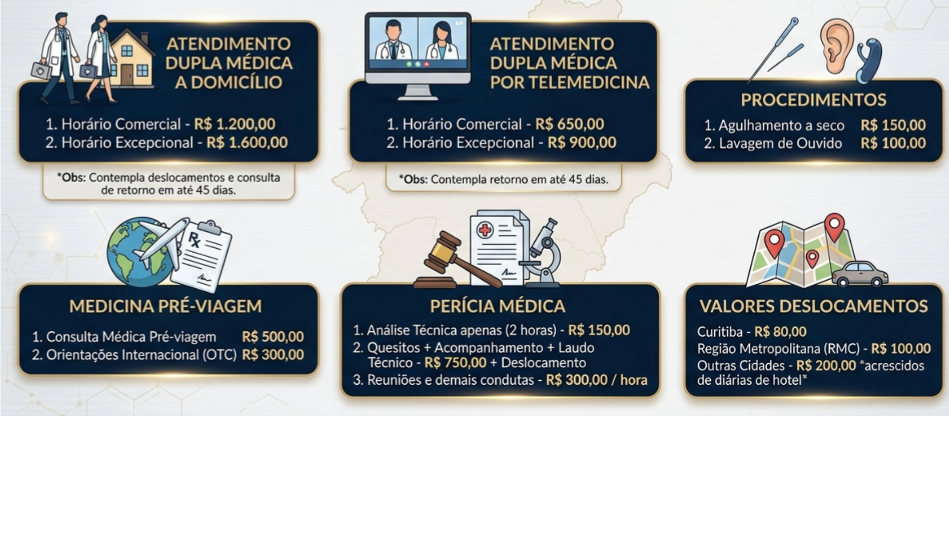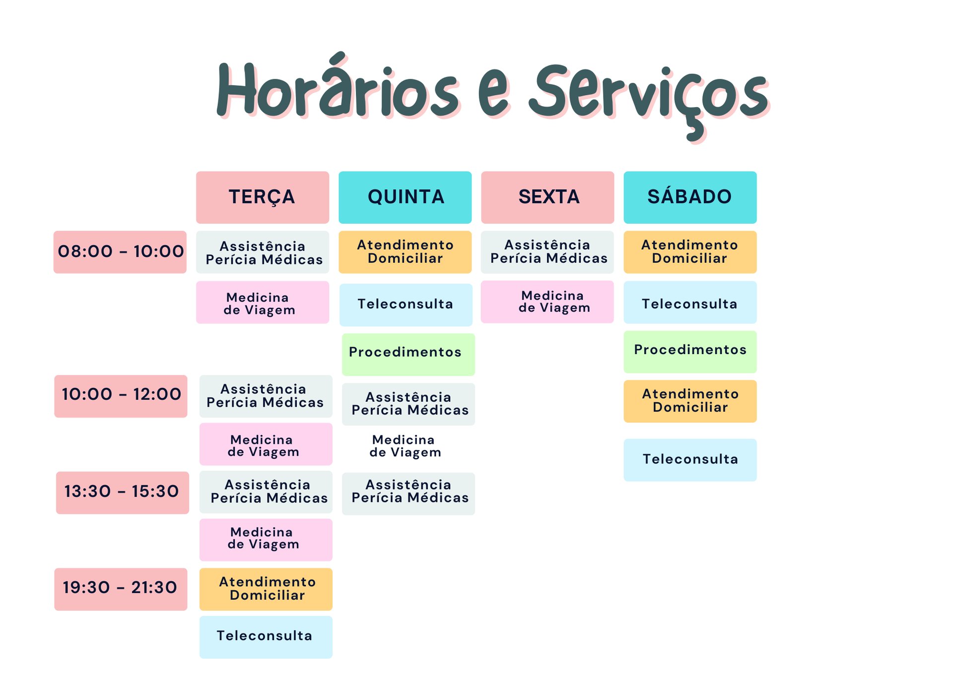 * Consultas e outros serviços nos sábados e domingos em horário excepcional estão disponíveis em algumas semanas sob acordo prévio.